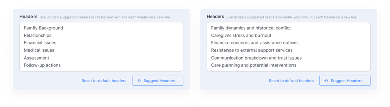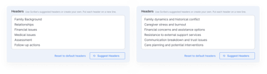 I started by exploring how Scribe could help users generate better headers for their summaries. Using prompts in Scribe’s backend model, I tested an early concept where Scribe would automatically suggest headers based on the conversation. Users could regenerate different sets of headers until they found one that fit their needs.