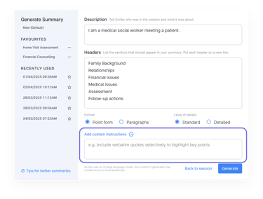 We introduced an expandable "Add custom instructions" field in the Generate Summary modal. This allows users to optionally provide custom instructions to influence the summary output. To help less savvy users get started, the field includes placeholder text with a lightweight example reflecting a common need — such as quoting clients verbatim.