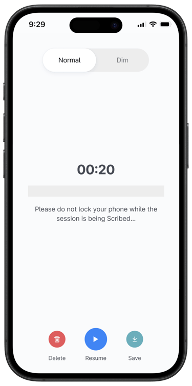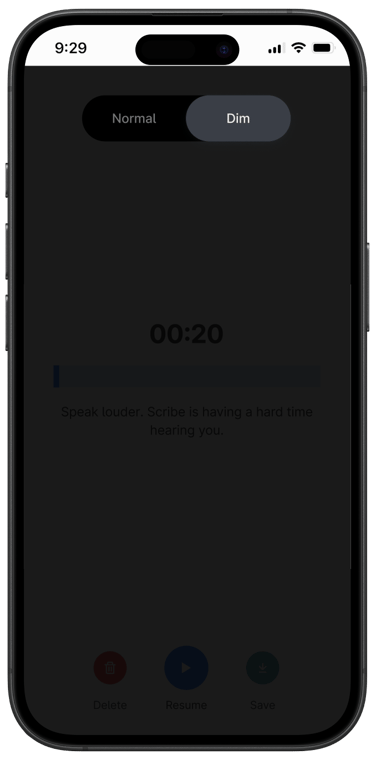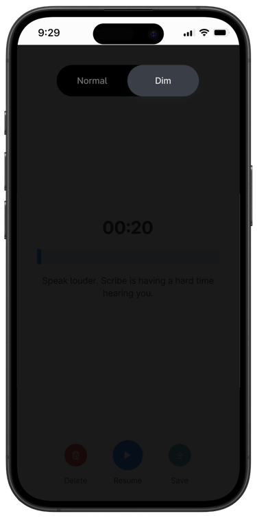 To reduce visual distraction during sessions, we introduced a Dim Screen mode that darkens the recording interface. It keeps the recording indicator visible to practitioners while helping clients feel more at ease in sensitive conversations.